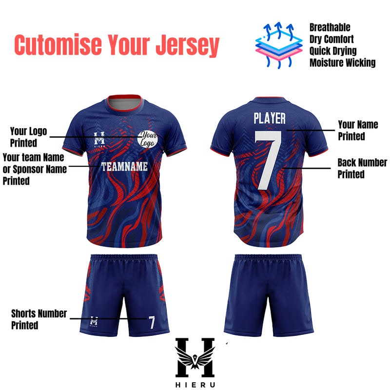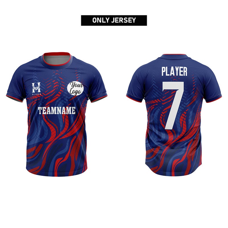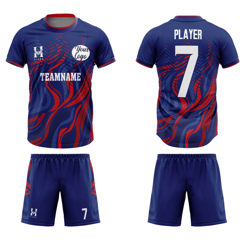 This blue and red patterned soccer jersey is the perfect choice for any avid football player. The lightweight, breathable material allows for optimal performance on the field, while the eye-catching design ensures that you stand out from the competition. Show off your skills in style with this high-quality jersey.